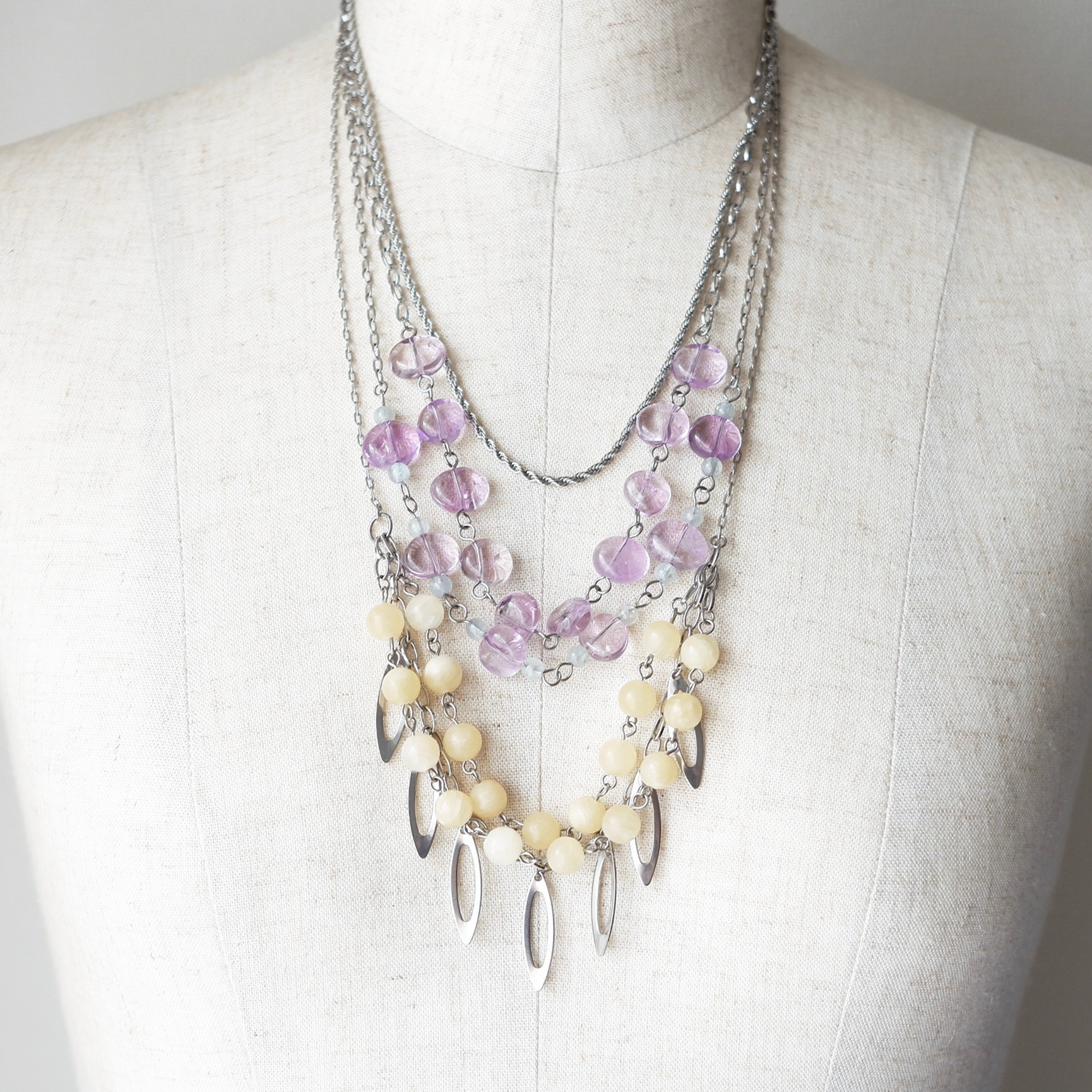 アメジスト、アメジスト&アクアマリンのネックレスに、淡いイエローのアラゴナイトのネックレスをアレンジ