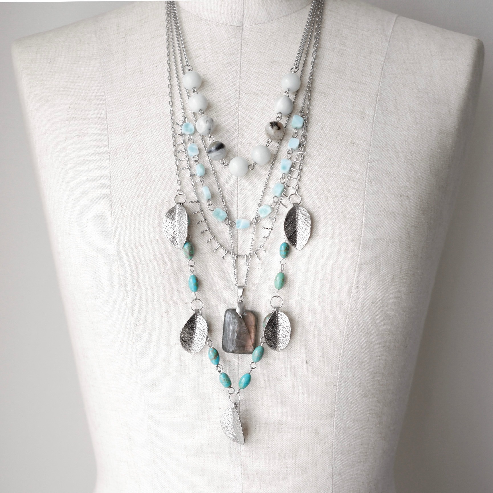 同系色で揃えたターコイズ、ラリマー、ラブラドライト、アマゾナイトの重ね付けアレンジ。白シャツに映えそう。